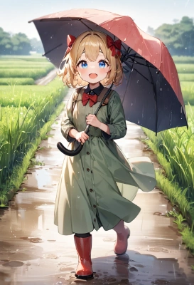1girl,solo,short hair,blonde hair,blue eyes,red ribbon,hair ornament,(hair bow:1.4),red bow,blowing bubblegum,walking outside,detailed background,anime style,japanese anime style,young girl,casual clothing,playful expression,city street,sunny day,sidewalk,trees,buildings,vibrant colors,energetic,carefree,blowing bubble,urban environment,cheerful,dynamic pose,lighthearted,fun,youthful,soft lighting,everyday scene,relaxed,modern setting,playful activity,enjoying day,breeze,colorful,cheerful atmosphere,spirited,