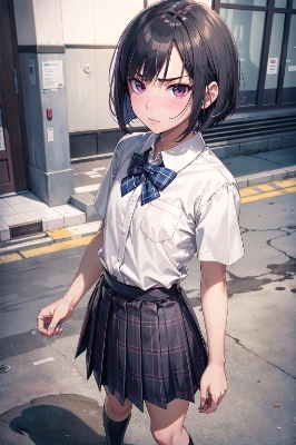 (SFW:1.6), (masterpiece, best quality, awesome extremely realistic, high resolution:1.3), girl, Japanese, 17yo, (tiny:1.3), high school student, BREAK (black short bob, straight hair:1.4), bangs, (tsurime:2.1), (very thin eyes:1.9), (thick eyebrow:1.4), closed mouth, (looking up:1.7), (blush:1.4), (flat chest:1.7), BREAK (plaid bow:1.5), (round collared cutter shirt:1.6), (pleated midi skirt:1.7), black socks, Brown rofers
