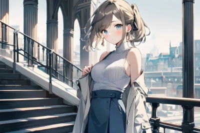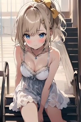 Masterpiece, Photo realistic, Best Quality, Highest Quality, Ultra Detailed, Extremely Detailed, Highly Detailed, Ultra High Definition, Ultra High Resolution, Soft Clean Focus, Realistic Lighting and shading, brakes. 1 girl, 16 Years Old, Cutie, Petite, Idol, Medium hair, Shiny gold hair, Hair bow, Ponytail, Blue eyes, Sensual Skin, Silky Skin, Glamorous Skin, Medium Breast, Firm Breast, Fresh Breast, White ruffle cami lace long dress, White deck shoes, brakes. Take a breath before you take ten steps up the stairs.I,,