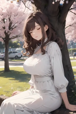 1 lady, brown hair, wavy hair, big breasts,white blouse, long skirt, (cowboy shot) (spring), (sitting near tree), sleeping, looking at viewer, ,street, flower, ,,,Art Style 2.0