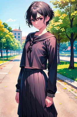 (SFW:1.6), (masterpiece, best quality, awesome extremely realistic, high resolution:1.3), girl, Japanese, 17yo, (tiny:1.3), high school student, BREAK (black short bob, straight hair:1.4), bangs, (tsurime:2.1), (very thin eyes:1.9), (thick eyebrow:1.4), closed mouth, (looking up:1.2), (blush:1.4), (flat chest:1.7), (disdain:1.9), BREAK (plaid bow:1.5), (round collared cutter shirt:1.6), (pleated midi skirt:1.7), black socks, Brown rofers