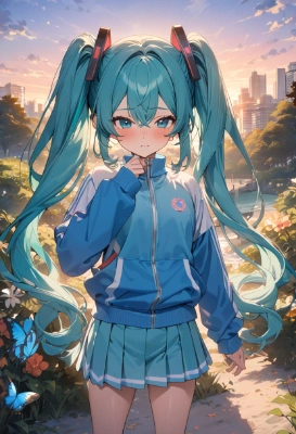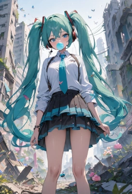 masterpiece, best quality, extremely detailed, anime, girl, skirt1girl, hatsune miku, vocaloid, masterpiece, best quality, rating: general, newest,blue hair,green hair,mini skirt,twintail,longhair,blue eyes,che gum,necktie,earphone,fantasy,chewing gum,ruins,city,flower,butterfly