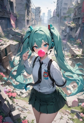 masterpiece, best quality, extremely detailed, anime, girl, skirt1girl, hatsune miku, vocaloid, masterpiece, best quality, rating: general, newest,blue hair,green hair,mini skirt,twintail,longhair,blue eyes,che gum,necktie,earphone,fantasy,chewing gum,ruins,city,flower,butterfly