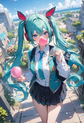 masterpiece, best quality, extremely detailed, anime, girl, skirt1girl, hatsune miku, vocaloid, masterpiece, best quality, rating: general, newest,blue hair,green hair,mini skirt,twintail,longhair,blue eyes,che gum,fantasy,city,flower,school,park,clear ,chewing gum,necktie,earphone,frog,forest,rain,ruins