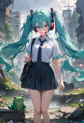 masterpiece, best quality, extremely detailed, anime, girl, skirt1girl, hatsune miku, vocaloid, masterpiece, best quality, rating: general, newest,blue hair,green hair,mini skirt,twintail,longhair,blue eyes,che gum,fantasy,city,flower,school,park,clear ,necktie,earphone,frog,forest,rain,ruins