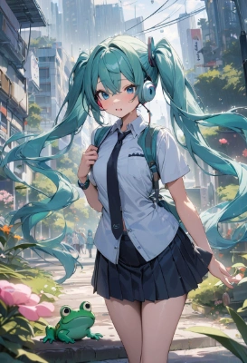 masterpiece, best quality, extremely detailed, anime, girl, skirt1girl, hatsune miku, vocaloid, masterpiece, best quality, rating: general, newest,blue hair,green hair,mini skirt,twintail,longhair,blue eyes,che gum,fantasy,city,flower,school,park,clear ,necktie,earphone,sea,forest,chewing gum,beach