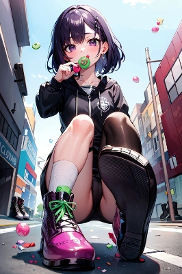 purple hair,black inner hair,black eyes,evil grin,wear white cyberpunk clothing and goggles,(blowing a chewing gum bubble:1.5),bicycle parking in the background,kawsaki ninja 400