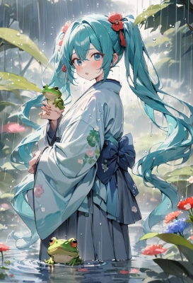 masterpiece, best quality, extremely detailed, anime, girl, 1girl, hatsune miku, vocaloid, masterpiece, best quality, rating: general, newest,blue hair,green hair,twintail,longhair,blue eyes,che gum,flower,clear ,frog,rain,aqua,water,watercolor,Japanese style,fantasy