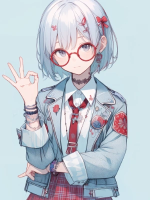 (blurry background:1.3), (Light blue background:1.3), (extremely detailed fine touch:1.3), (hard light, studio light, light rays, dappled light, reflection, shadows, ray tracing:1.0), (rough sketch:1.3), ///, kawaii girl, Pink background, illustration, delicate and detailed, girl with short white hair, green sunglasses, hand sign, cool atmosphere, one-piece dress, stylish, long boots, small smile, bracelets, earrings