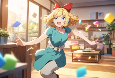 1girl,solo,blonde hair,blue eyes,short hair,(hair bow:1.3),red bow,waking up,bed,pajamas,surprised expression,panicked expression,open mouth,wide eyes,hands pushing on bed,messy bed,blanket,pillow,indoor,bedroom,morning light,clock showing late time,sunlight through window,disheveled hair,rushing,anime style,masterpiece,best quality,very aesthetic,absurdres:1.3,