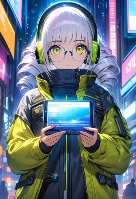 masterpiece, best quality, extremely detailed, anime, absurdres, (solo girl), (((white hair, long drill hair))), original character, blushing, ((thick-rim glasses,headphone, white shirt)), upper body, front facing, ((fixing red necktie by ownself))<lora:flat1:0.3> <lora:saturation:0.25>,,,