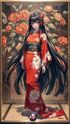 majestic adorable, japanese cinematic horror, three-dimensionality, drawing highlights, realistic texture, extremely detailed, beautiful and aesthetic, full body, (neo Japanese doll) (in a glass case:1.3), (Shiny straight black hair, Horror-like (long bangs), Horrifyingly (over absurdly long hair:1.5), (A bright red kimono with intricately printed gold embroidery and Japanese Florals)). Japanese pattern background, black background, <lora:hairdetailer:0.5>