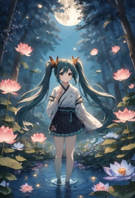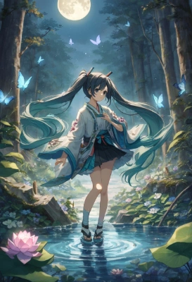 1girl, hatsune miku, vocaloid, hydrangeamasterpiece, best quality, rating: general, newesthydrangea,twintail,longhair,black hair,water,flower,butterfly,skirt,mini skirt,forest,ruins,night,full moon,magic, ,black eyes,Japanese style,watercolor,lotus <lora:gloweyes_v100:1> <lora:hyperdetailer_v060.safetensors:1>