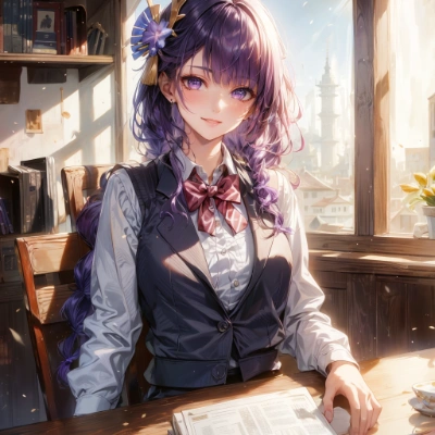hires, cinematic angle,beautiful face,finely detail, masterpiece, best quality, ultra-detailed,Photorealistic,8k,lens flare,intense shadows,Studio,dreamy washes,bokeh photography,dreamy ambiance,beautiful detailed glow,colorful refraction,golden hour lighting,backlighting,colorful lighting,1girl, solo,full body,from front,(watercolor \(medium\):0.25),<lora:watercolor:0.25>,<lora:midjourney_20230624181825:0.35>,(xuer swing:0.25),<lora:xuer swing_20240215221119:0.25>,<lora:flat2:-0.5>,<lora:raidenshogun1-000009:0.8>,(raidenshogundef:0.5),(raiden shogun:1.0),(cool woman,mature female,mature,30 years old:1.1),(purple eyes,braid,purple hair,long hair,blunt bangs,:1.2),flower hair ornament,medium breasts,seductive smile,looking at viewer,(sitting on chair:1.2),smile,(sexy secretary:1.2),(suit,vest,white shirt,pink bow,black skirt,:1.3),(modern detective’s office,:1.2),table,chair,bookshelf,shelf,fantasy,fancy,cute