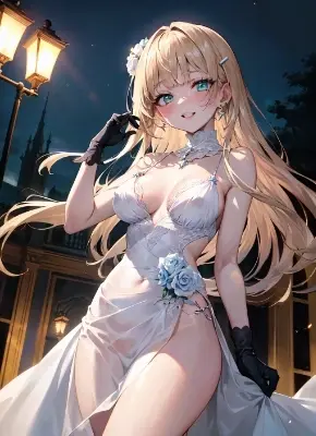 blonde long hair, (blunt bangs:1.3, bangs cover eyes),( flipped out bangs to outside:1.2) , beautiful aqua eyes,( blush, ), whispering, toothy smile, White Floral Hair Clip,
