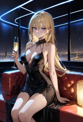 High quality, Ultra detailed, best quality, insanely detailed, beautiful, masterpiece,1girl,blonde hair,lightly long hair,misty face,black night dress,champagne, BREAK,a disco type bar with lights and a couch that is lit with blue lights, scenery,, (chibi),