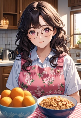 (best quality,8K, textile shading, upper body, cinematic), focus face, (ultra detailed face), (solo:1.2), (1girl), (breakfast), (school uniform:1.2), (wearing floral pink apron:1.1), (glasses, black hair, firm and solid younger sister, oversized clothes),(In a traditional kitchen with wooden cabinets and a checkered tablecloth), (various breakfast items like cereal boxes, milk, and fruits), (looking at viewer:1.1), curvy, wavy hair, diamond-shaped face, droopy eyes, extremely beautiful girl, delicate and beautiful hair, precise detailed, full of joy and energy,