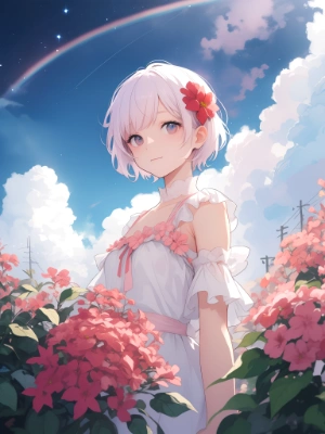 (white background:1.3), (extremely detailed fine touch:1.3), (hard light, studio light, light rays, dappled light, reflection, shadows, ray tracing:1.0), (rough sketch:1.3), mixed media, ink paint, ///, kawaii girl, brown short hair, upper body , (flower:1.3), (zentangle:1.3), wall full of green leaves