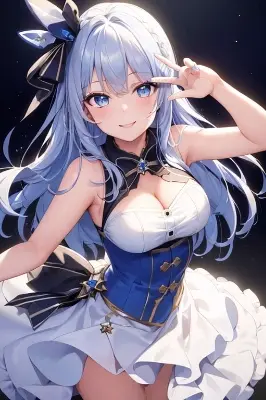 (best quality, masterpiece_1.2), one young girl, dark blue hair, purple eyes, smile, white dress, mini skirt, wave hands, mark in eyes, holding a mic, full body view, dancing, highly detailed face and eyes, clearly outlined, single character, long hair,