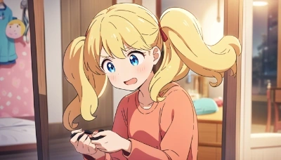 1girl with blonde hair,blue eyes,short hair,(hair bow:1.3),red bow,walking freely and leisurely along a lakeshore,calm expression,rippling water reflecting sunlight,trees and mountains surrounding lake,bright blue sky with fluffy white clouds,anime-style,highly detailed landscape painting,