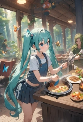 masterpiece, best quality, extremely detailed, anime, girl, skirt1girl, hatsune miku, vocaloid, masterpiece, best quality, rating: general, newest,mini skirt,blue hair,green hair,twintail,longhair,blue eyes,kids meal,fantasy,cooking,flower,forest,restaurant