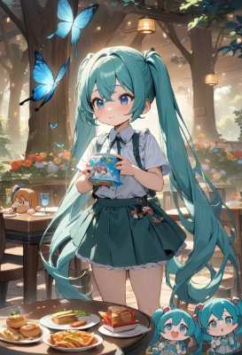masterpiece, best quality, extremely detailed, anime, girl, skirt1girl, hatsune miku, vocaloid, masterpiece, best quality, rating: general, newest,mini skirt,blue hair,green hair,twintail,longhair,blue eyes,kids meal,fantasy,cooking,flower,forest,restaurant,fairy,butterfly