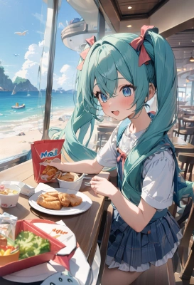 masterpiece, best quality, extremely detailed, anime, girl, skirt1girl, hatsune miku, vocaloid, masterpiece, best quality, rating: general, newest,mini skirt,blue hair,green hair,twintail,longhair,blue eyes,kids meal,fantasy,flower,forest,restaurant,fairy,butterfly