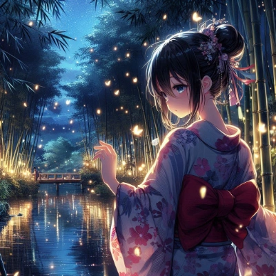 8K,(masterpiece),high resolution,best quality,(ultra-detailed),(ultra detailed eyes),night,black hair,kimono,hydrangea,japanese lights,blush,Holding a light in your hand,Exposing the shoulders,,full body,from back,wide-shot,