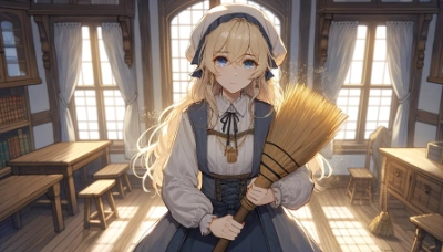 A highly detailed anime schoolgirl with long, flowing black twin ponytails tied with blue and white striped ribbons, wearing a navy blue and white sailor school uniform with a pleated skirt. She is standing in a bright, sunlit classroom with wooden desks and chairs, holding her ponytails with both hands, and has large, expressive blue eyes and a shy smile on her blushing face. The classroom has a green chalkboard, a clock on the wall, and windows letting in natural light.