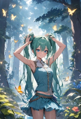 masterpiece, best quality, extremely detailed, anime, girl, skirt1girl, hatsune miku, vocaloid, masterpiece, best quality, rating: general, newest,mini skirt,twintail,longhair,blue hair,green hair,blue eyes,twin tails,bunching hair,long hair,idol,fantasy,butterfly,magic,forest,flower,fairy,water,wet hair