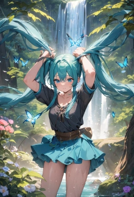 masterpiece, best quality, extremely detailed, anime, girl, skirt1girl, hatsune miku, vocaloid, masterpiece, best quality, rating: general, newest,mini skirt,twintail,longhair,blue hair,green hair,blue eyes,twin tails,bunching hair,long hair,fantasy,butterfly,magic,forest,flower,fairy,water,wet hair,muscles