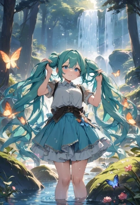 masterpiece, best quality, extremely detailed, anime, girl, skirt1girl, hatsune miku, vocaloid, masterpiece, best quality, rating: general, newest,mini skirt,twintail,longhair,blue hair,green hair,blue eyes,twin tails,bunching hair,long hair,fantasy,butterfly,magic,forest,flower,fairy,water,wet hair,waterfall,a pretty woman