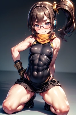 (tight armor, gauntlet, black tight suit, Long skirt with mini length in the front), toned stomach, sweat, flat chest, abs covered by clothes,