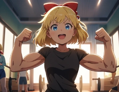 1girl,solo,short hair,blonde hair,blue eyes,(hair bow:1.4),red bow,chibi,red ribbon,hair ornament,doing push-ups,building muscles,detailed background,anime style,japanese anime style,young girl,determined expression,indoors,workout setting,casual clothing,focused,energetic,playful,vibrant colors,soft lighting,cheerful atmosphere,exercise,fitness,strength training,warm tones,spirited,engaging,healthy,active,enthusiastic,everyday life,personal goal,perseverance,effort,dedicated,motivated,indoors,