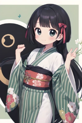 1 girl,(((very longest hair))),smile, Black hair,straight Hair,hair ribbon,mintgreen stripe,Black Eyes,flat chest,straight Across bangs,princess Cut, Very Long Sideburn,roundry Head,Droping eyes,cute,Meekness,Bob Cut,long back hair,12 years Old,loli
