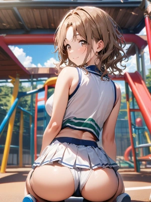 sexy cheer, a vibrant school playground, a spacious outdoor area with various play equipment, with windows overlooking the playground and flags flying from the rooftop, bright and clear, with puffy white clouds adding to the cheerful atmosphere,, censored, mosaic censoring,