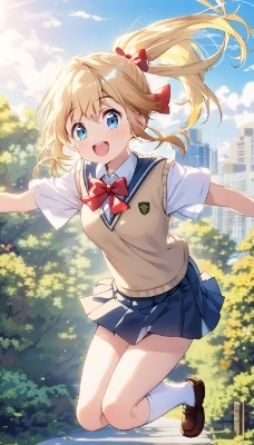 1girl,solo,short hair,blonde hair,blue eyes,(hair bow:1.4),red bow,red ribbon,hair ornament,in kitchen,mixing flour and water,whisking with mixing stick,detailed background,anime style,japanese anime style,young girl,casual clothing,focused expression,cooking,baking,cozy kitchen,soft lighting,cheerful atmosphere,ingredients on counter,home environment,gentle shadows,everyday scene,warm colors,childlike,learning to cook,playful,enjoying the process,apron,bowls,utensils,concentrated,homely,