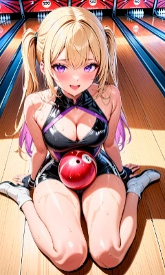 cute,1girl,ultra high res,masterpiece,best quality,high quality, BREAK, blue volleyball_uniform,shorts,sleeveless,tight fitting,camel toe, BREAK, blunt bangs,long hair,low ponytail,Orchid and Licorice hair color,indigo eye,wet hair, BREAK, Leaning against a wall with one knee bent,sweat,smile,opened mouth,dynamic angle, BREAK, (erect nipples:1.1),flat chest,cleavage, BREAK, indoor,volleyball court,holding volleyball,elbow pads