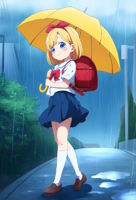 1girl,School uniform,blond ponytail,big blue ribbon,tsundere,tight eyes,confident expression,a little bit gal,American girl,blue eyes,age15, standing on stage, holding microphone, singing, tsundere, blush, shy expression, confident posture, casual clothes, cute dress, spotlight, stage lights, audience in background, concert, music notes, indoor stage, red curtains, wooden floor, energetic atmosphere, anime style, masterpiece, best quality, very aesthetic, absurdres:1.3
