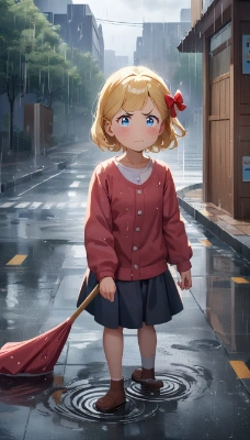 1girl,solo,short hair,blonde hair,blue eyes,red ribbon,hair ornament,(hair bow:1.3),red bow,(holding parasol:1.3),walking outside,detailed background,anime style,japanese anime style,young girl,casual clothing,sunny summer day,vibrant colors,cheerful atmosphere,protective from sun,bright sunlight,hot weather,playful,lighthearted,everyday life,engaging,soft shadows,warm tones,cool shade,serene,charming,expressive,scenic,joyful,pleasant,relaxing stroll,calm,summer dress,smiling,radiant,