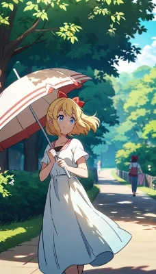 2 girls,blonde hair,blue eyes,short hair,( hair bow:1.3),red bow,standing,(under large parasol:1.5),(parasol1:0.3),smiling,happy expression,summer,sunny day,blue sky,casual clothes,white sundress,sandals,beach setting,sand,ocean in background,waves,bright sunlight,cheerful,relaxed,playful,vibrant colors,gentle breeze,anime style,masterpiece,best quality,very aesthetic,absurdres:1.3,
