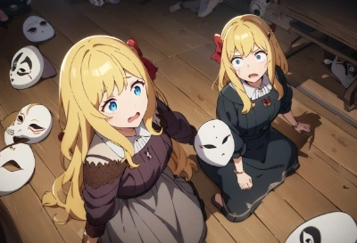 1girl,blonde hair,blue eyes,short hair,hair bow,red bow,(hair bow:1.4),red bow,(holding mask:1.5),trying to wear mask,thoughtful expression,casual clothes,white blouse,skirt,indoors,dim lighting,mysterious atmosphere,old mansion,detailed mask,ornate design,soft shadows,delicate features,anime style,masterpiece,best quality,very aesthetic,absurdres:1.3,