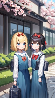 2girls,1 girl,blonde hair,blue eyes,short hair,(hair bow:1.2),red bow,1 girl,black hair,long hair,headband,black eyes,dark mansion,indoors,(multiple masks:1.4),(masks on the floor:1.4),surprised expression,scared expression,sitting on the floor,falling back,dim lighting,spooky atmosphere,old furniture,cobwebs,dusty,shadows,detailed masks,detailed expressions,casual clothes,dress,skirt,blouse,anime style,masterpiece,best quality,very aesthetic,absurdres:1.3,