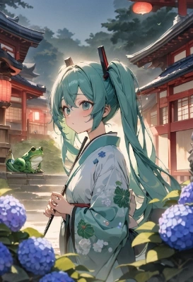 masterpiece, best quality, extremely detailed, anime, girl, 1girl, hatsune miku, vocaloid, masterpiece, best quality, rating: general, newest,blue hair,green hair,twintail,longhair,mask,fox girl,Japanese style,watercolor,full moon,night,blue eyes,horror