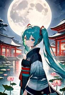 masterpiece, best quality, extremely detailed, anime, girl, 1girl, hatsune miku, vocaloid, masterpiece, best quality, rating: general, newest,blue hair,green hair,twintail,longhair,mask,Japanese style,watercolor,full moon,night,blue eyes,horror,shrine,water,lotus
