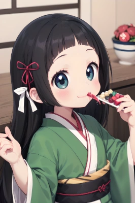 1 girl,(((very longest hair))),black hair, smile,straight Hair,hair ribbon,mintgreen stripe,Black Eyes,flat chest,straight Across bangs,princess Cut, Very Long Sideburn,roundry Head,Droping eyes,cute,Meekness,Bob Cut,long back hair,12 years Old, kimono,stripes