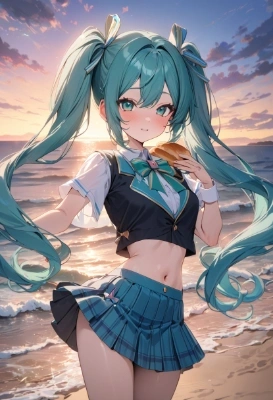 masterpiece, best quality, extremely detailed, anime, girl, skirt,1girl, hatsune miku, vocaloid, masterpiece, best quality, rating: general, newest,mini skirt,twintail,longhair,blue hair,green hair,green eyes,fantasy,colorful,beach,sea,beach at ,sunset,schoolgirl,idol,stripes,park