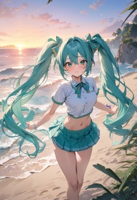 masterpiece, best quality, extremely detailed, anime, girl, skirt,1girl, hatsune miku, vocaloid, masterpiece, best quality, rating: general, newest,mini skirt,twintail,longhair,blue hair,green hair,green eyes,fantasy,colorful,beach,sea,beach at ,girl,idol,stripes,park,blue sky,schoolgirl