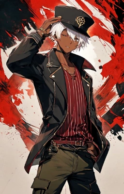 masterpiece, best quality, extremely detailed, high resolution, 8k, 16k, Japanese anime, (((1male))),BREAK ((silver hair:1.3)), (very short hair:1.3), (single braid), purple eyes, BREAK(male face, male eyes:1.3), half-closed eyes, (tsurime, with eyelashes), (beautiful detailed eyes:1.2), BREAK (facial muscle), (adam’s apple,larynx), (slender face), (glaring), 17 -year-old ,178cm tall, Stout, flat chest, original character, fantasy, BREAK (black background :1.3), (beautiful fingers:1.3), (leaning on wall, standing:1.2), (hand in pocket, hand in own hair:1.3), (leather, red colored chinese clothes:1.3), (clothes around waist), (black shoes:1.2), medium shot, shoot from front, looking at viewer
