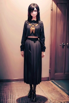 BREAK (black long hair, gold streaked hair, straight hair:1.4), bangs, (hair over left eye:1.6), (tsurime:2.1), (very thin eyes:1.4), closed mouth, (look down on disdain:1.9), (glare:1.6), (flat chest:1.7), right hand on chest, left hand on desk, BREAK from side, (black long sleeve sailor school uniform:1.6), (black pleated ankled skirt:1.9), (white ankle socks, converse low cut sneakers:1.9), BREAK standing, unmoving pattern, (full body:1.9), Sapporo city Odoori park, ,Color Booster<lora:EMS-59445-EMS:0.800000>